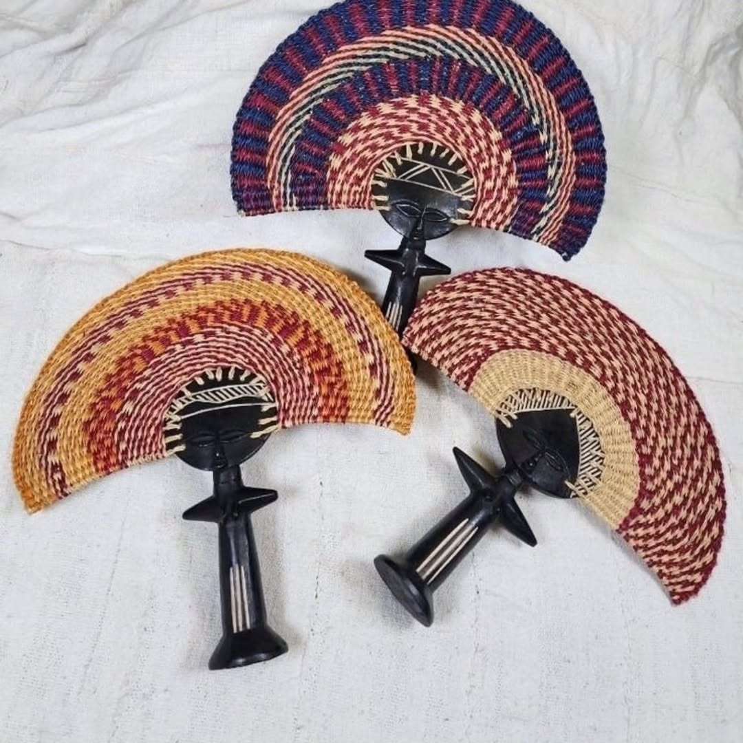 Akuaba hand carved fans Used to decorate walls, shelves, console tables. etc Comes in different priints and colours. Price Per Piece.